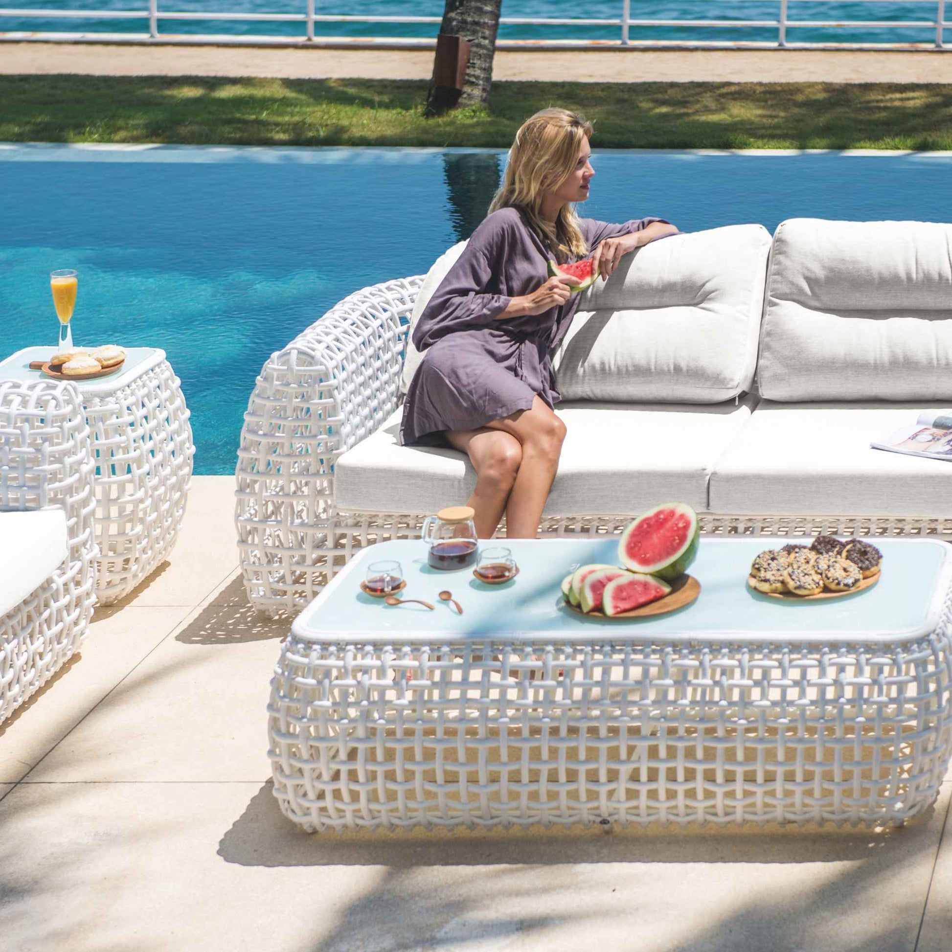 The Dynasty 5-Piece Seating Set is a perfect blend of modern luxury and durable craftsmanship. Designed for high-end outdoor living spaces, this set features a commercial-quality extruded aluminum frame wrapped in premium synthetic fibers for superior weather resistance. The Sunbrella cushions provide exceptional comfort and durability, ensuring long-lasting enjoyment in any environment. The contemporary open-weave design adds a sophisticated touch, making it ideal for patios, poolsides, and upscale resorts.