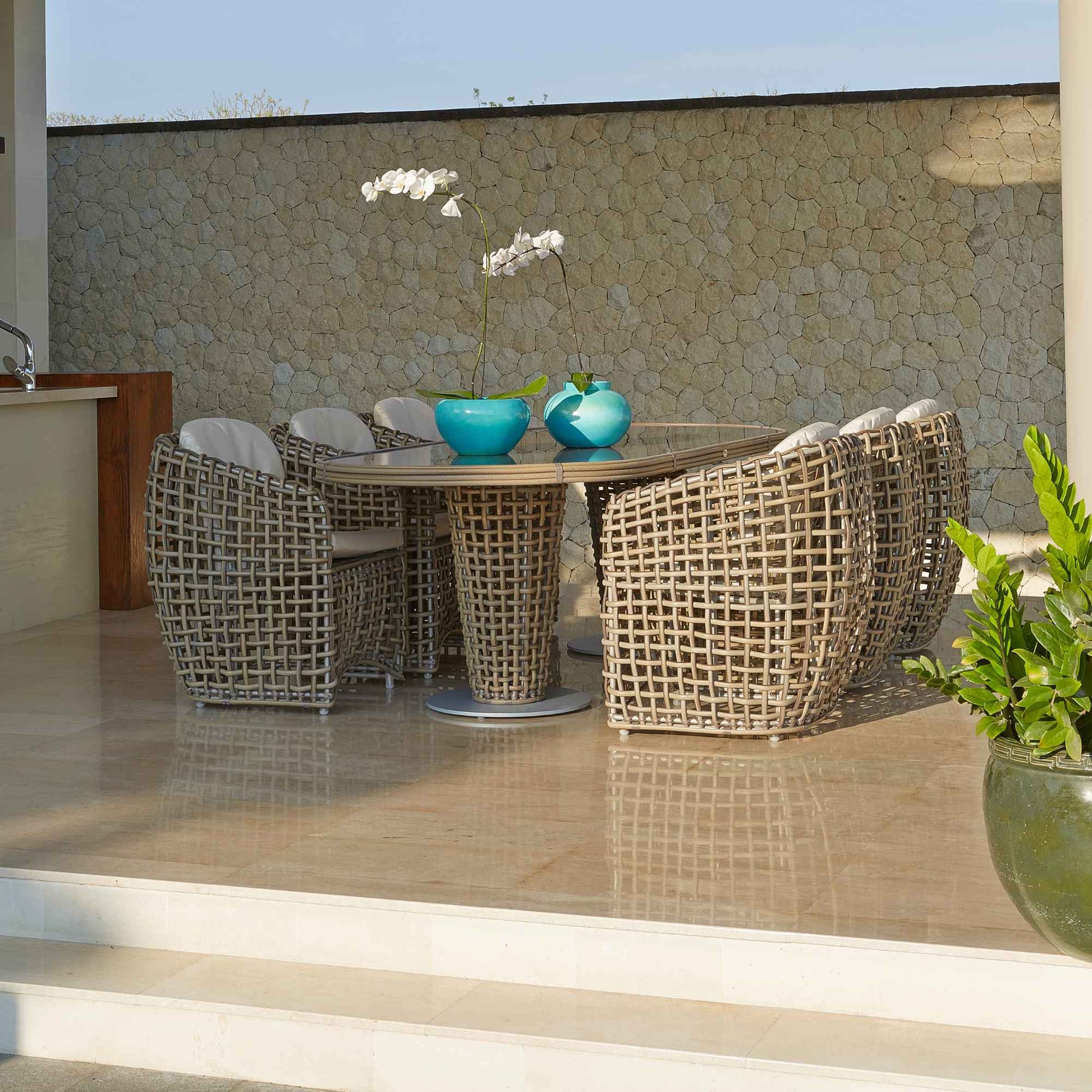 The Dynasty 7-Piece Dining Set with Sunbrella Cushion offers a luxurious and expansive dining solution for outdoor entertaining. Designed with a commercial-grade extruded aluminum frame and wrapped in premium synthetic outdoor fibers, this set ensures durability and timeless style. The set includes a spacious oval tempered glass dining table and six elegantly crafted armchairs with plush Sunbrella cushions for superior comfort. Available in Kubu Mushroom, Black Mushroom, and White Mushroom finishes, this dining set is perfect for hosting gatherings in upscale outdoor environments.
