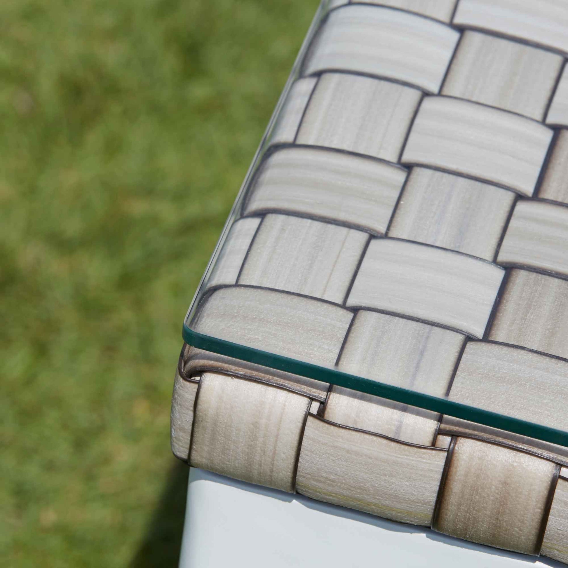Designed for larger gatherings, the Brafta Rectangular Dining Table blends modern lines with natural textures. It features a durable white aluminum frame, handwoven Ecolene Seashell fiber, and a tempered glass top—perfect for hosting sunny brunches or elegant alfresco dinners.