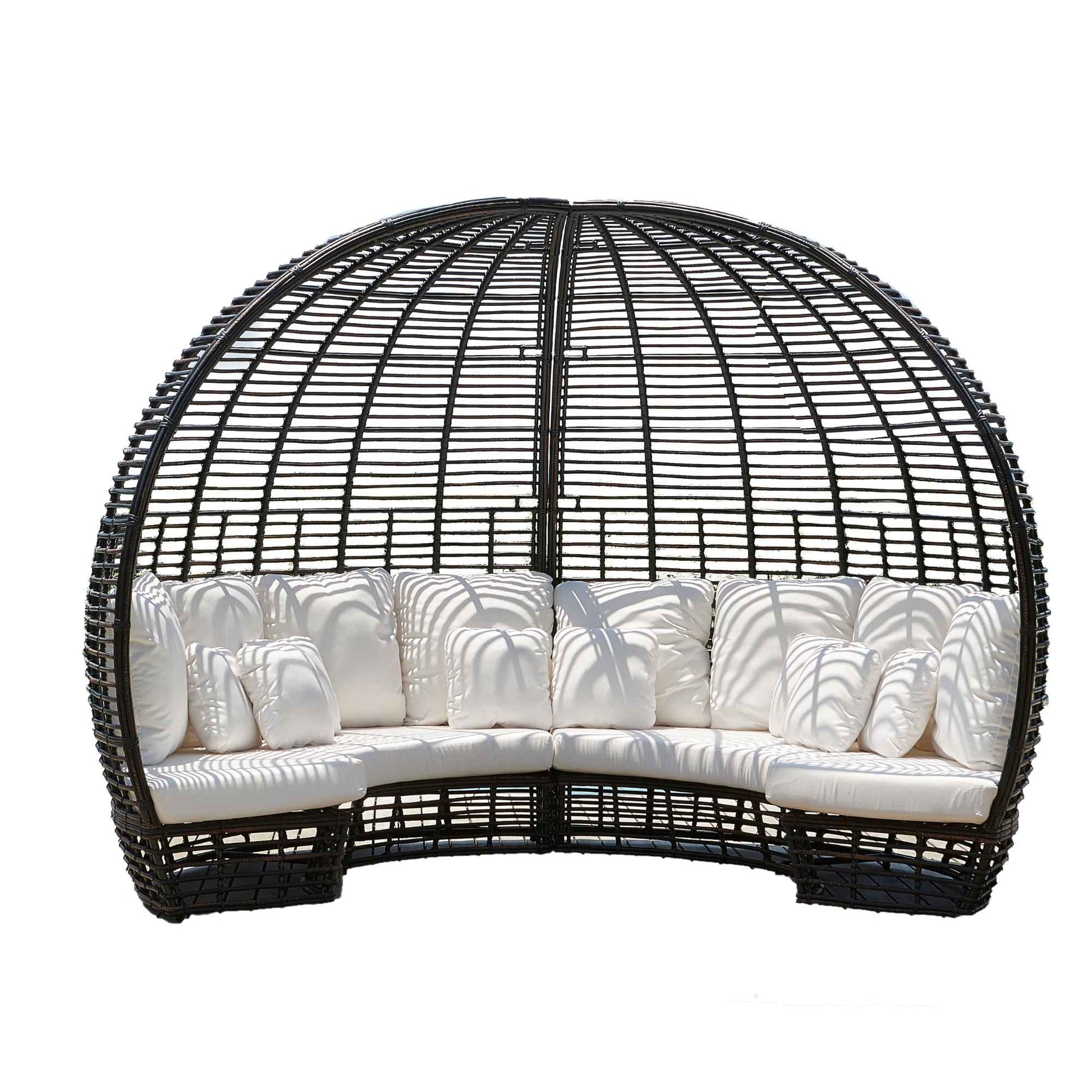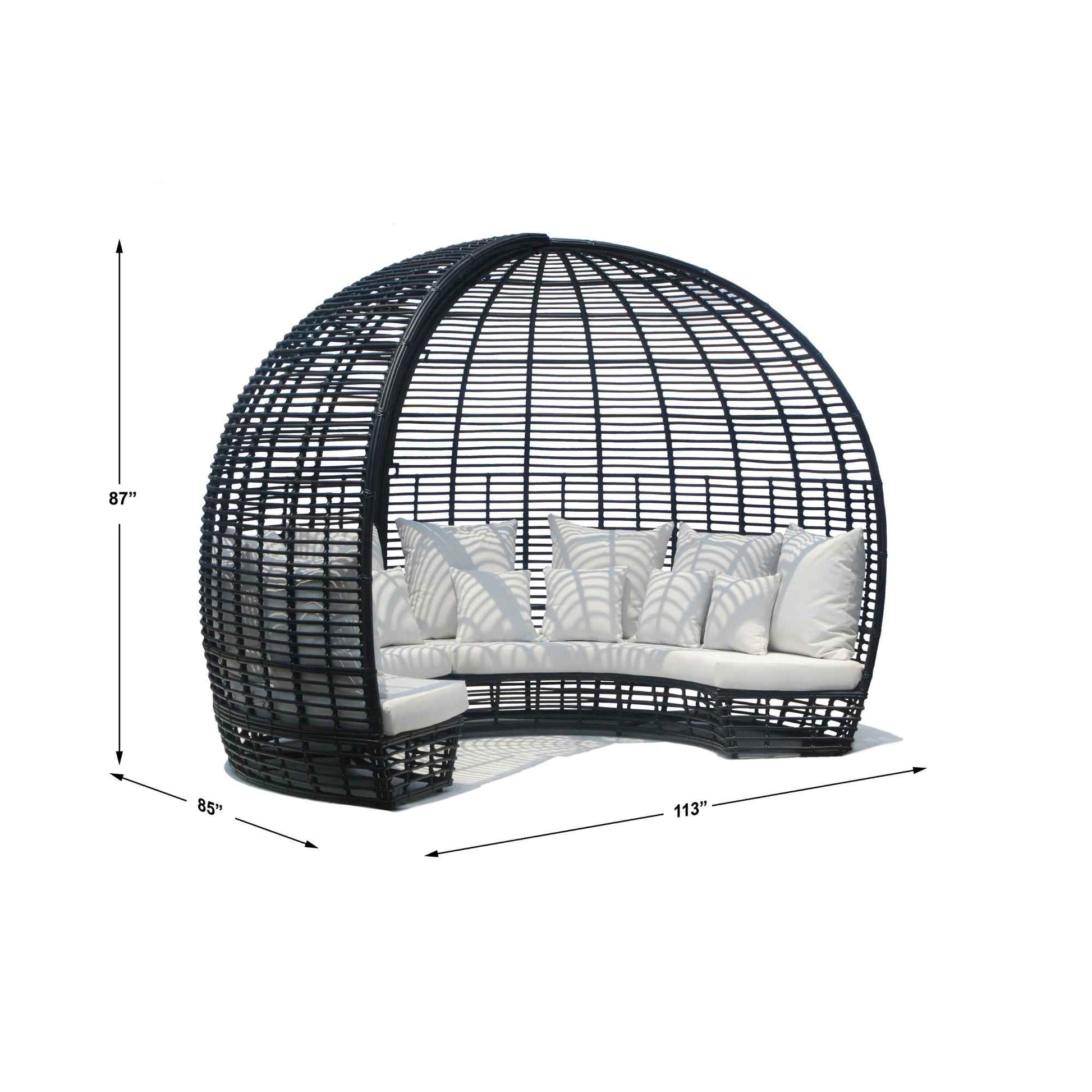The Nexus Daybed combines comfort, style, and function in one showstopping piece. Its dome-shaped canopy provides shade while plush Sunbrella cushions offer luxurious seating. At the center, a matching woven table with a glass top creates the ideal space for drinks or casual dining. Crafted with a durable aluminum frame and handwoven synthetic fiber. Available in Kubu Mushroom and Black Mushroom finishes.