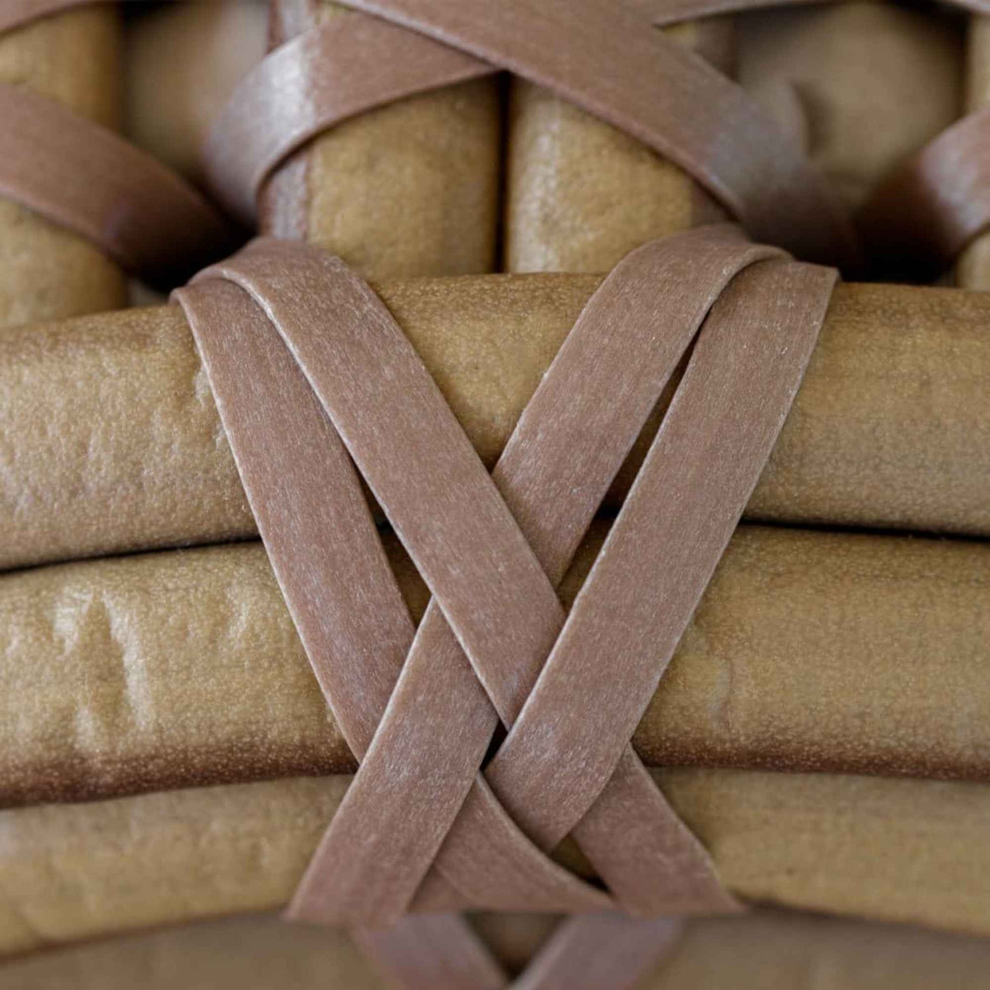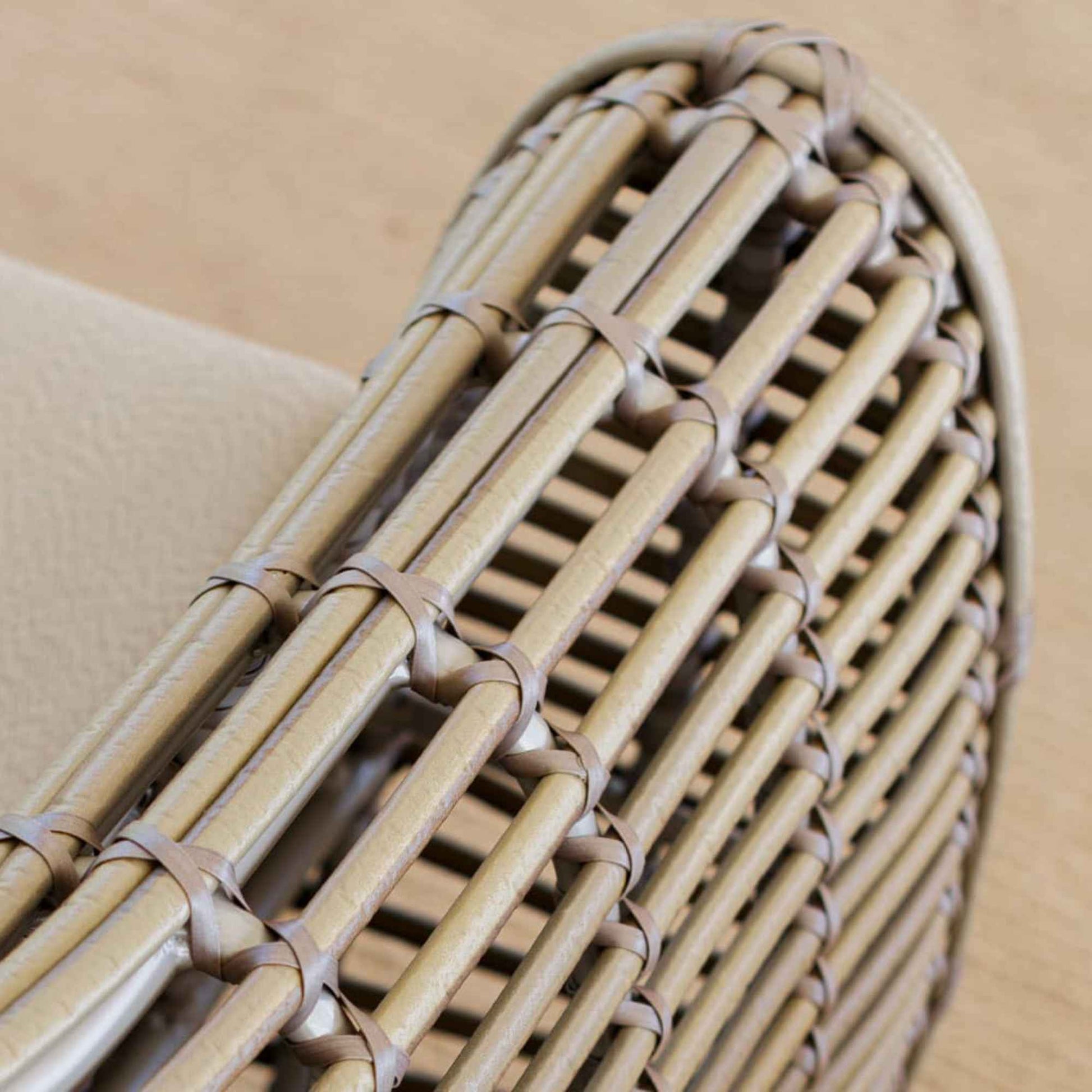 The Ruby Armchair combines modern elegance with durable craftsmanship. Featuring an aluminum frame in a silver walnut finish, it's wrapped in handwoven Ecolene Kubu Mushroom synthetic fibers for a sophisticated open-weave design. The Sunbrella cushion ensures comfort and weather resistance, making it perfect for outdoor lounging.
