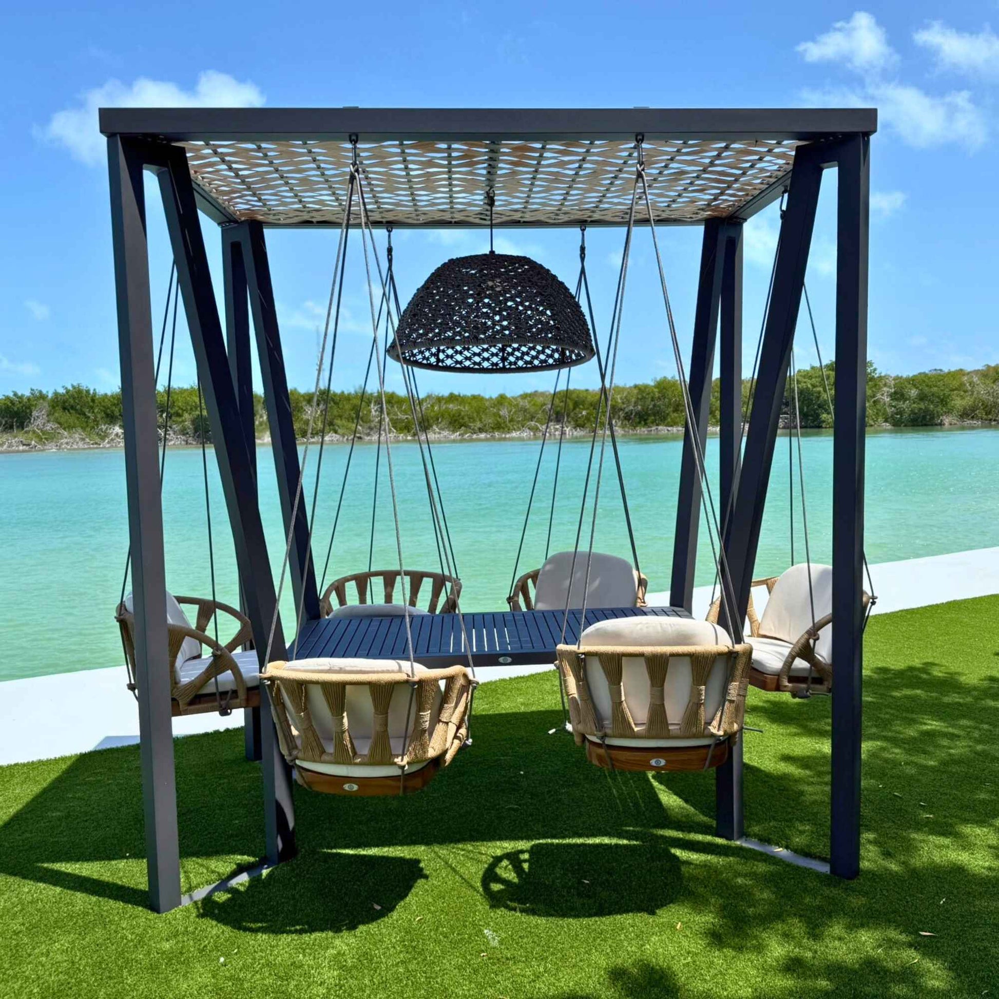 Add a sculptural statement to your outdoor dining space with the Horizon 8FT Pergola paired with Krabi Hanging Dining Chairs. Featuring handwoven rope seating with teak accents and a sleek aluminum table, this set delivers comfort, elegance, and visual impact—perfect for patios, rooftops, and high-end hospitality settings.