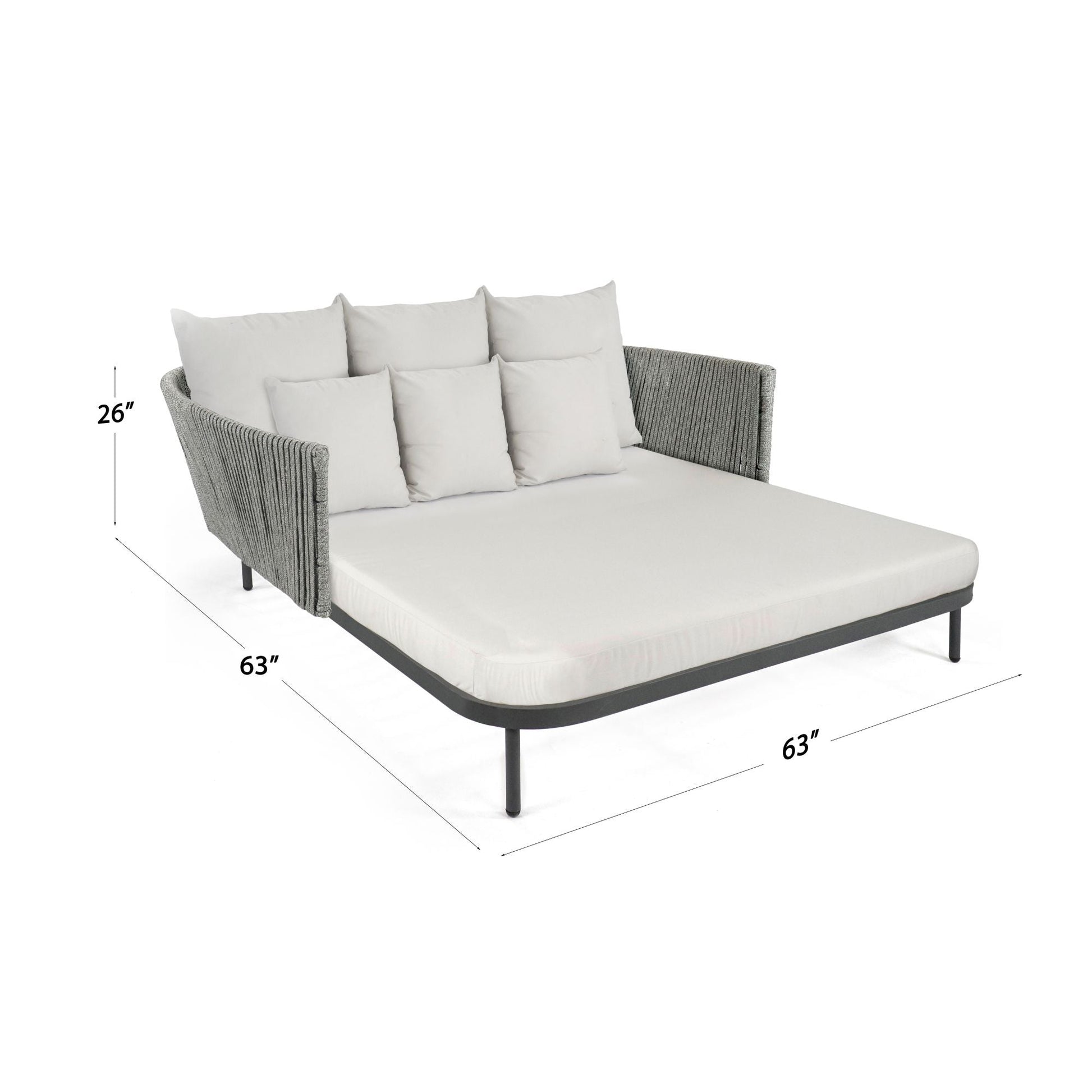 A captivating piece that effortlessly transforms any outdoor space into a stylish haven. Its broad backrests lend an intimate and unparalleled charm. The daybed features a powder-coated aluminum frame and a light gray polystrand strap rope. A comfortable cushion is included in 5453 Sunbrella Canvas or you can choose from other available Sunbrella options. Crafted for durability, the chaise lounger combines modern elegance with resistance against the elements. Create a personalized outdoor oasis with the Boston Outdoor Daybed where style, comfort, and durability converge.