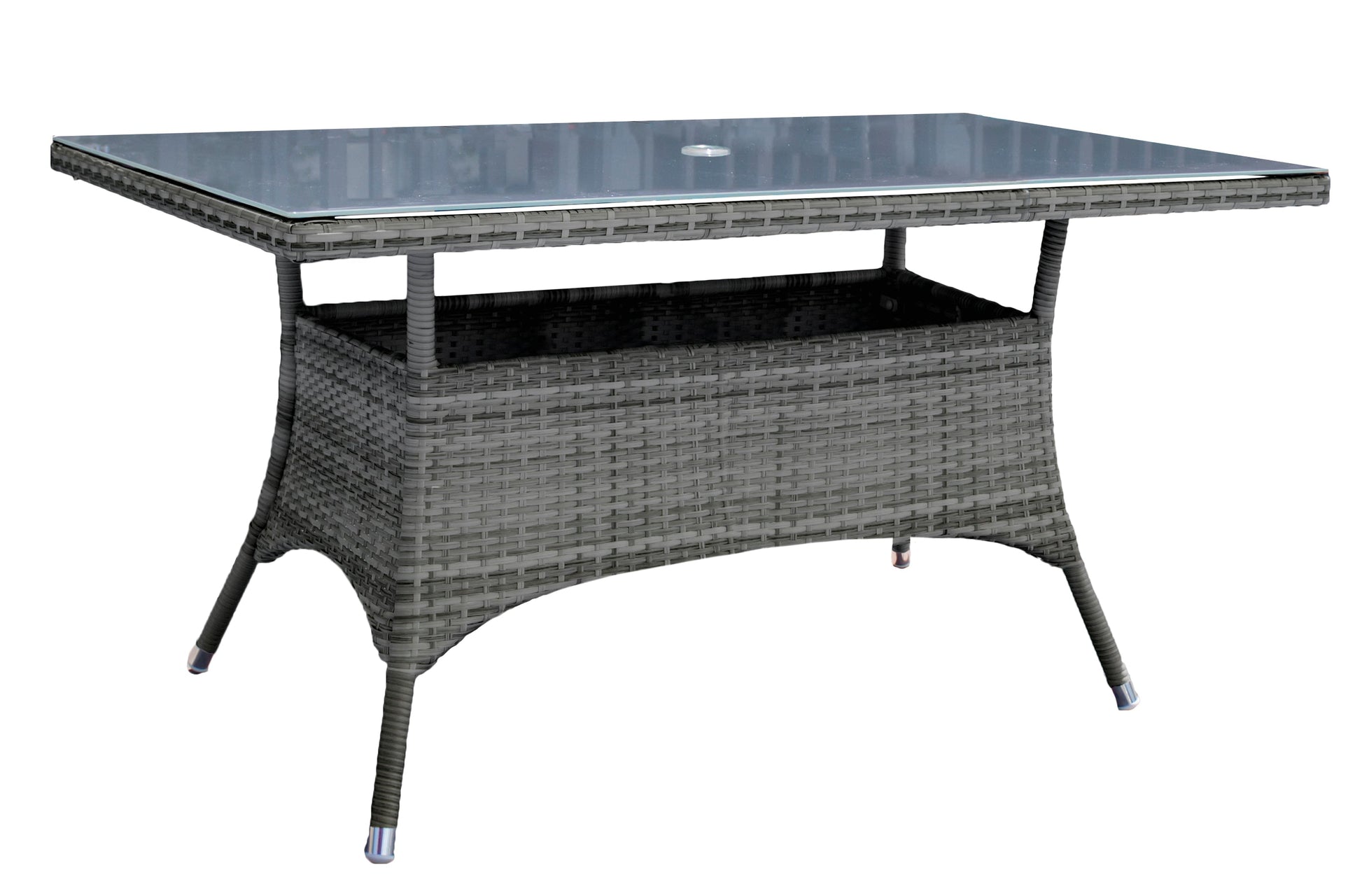 With the Spectrum 7 PC Woven Armchair Dining set, you can enjoy your outdoor space in style. This set features six woven armchairs and a rectangular dining table, all finished in a modern gray wash. The included standard off-white cushions are perfect for lounging, or choose from a variety of Sunbrella color options to add your own personal touch. The tempered glass table top provides additional support and protection. Ideal for outdoor dining or entertaining, this set is sure to elevate any patio or backyard.