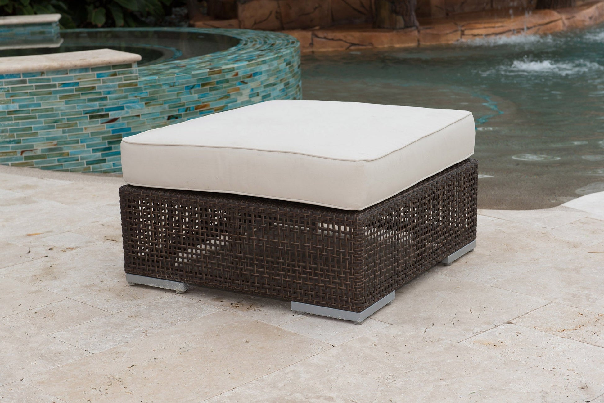 Elevate your outdoor space with the Atlantis Ottoman with Cushion, a part of the Atlantis Collection that blends modern design with comfort. This unique see-through modular sectional offers endless possibilities for a sofa, loveseat, armless chair, or standard sectional setup. The Ottoman boasts a fully anodized aluminum frame woven with Rehau Java Brown fiber, creating a distinctive look with a multi-colored textured surface perfect for outdoor use. The Sunbrella cushions come in a variety of colors and patterns, adding to the versatility of this ottoman, which can be used as a chair or added to a corner and middle seat to transform it into a sectional. With the Atlantis Collection, you can create a customized sectional that will impress your neighbors and enhance your outdoor decor.