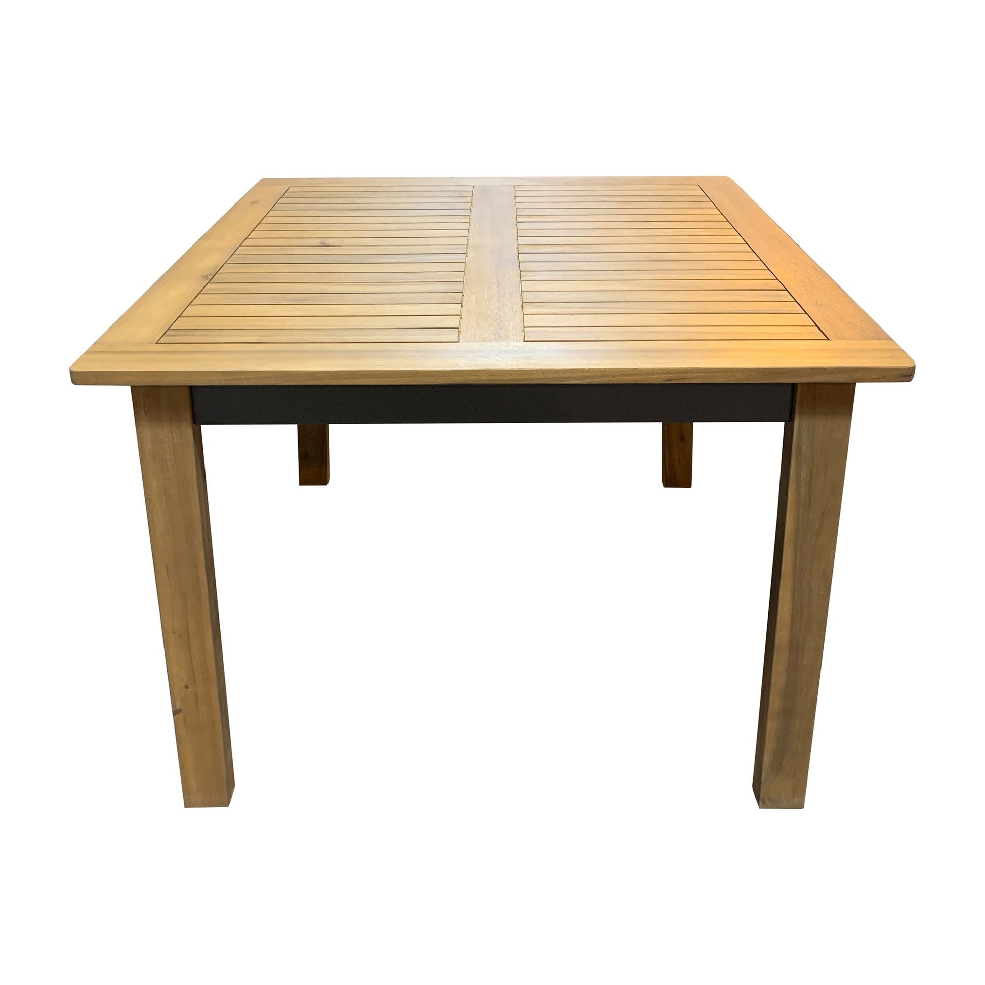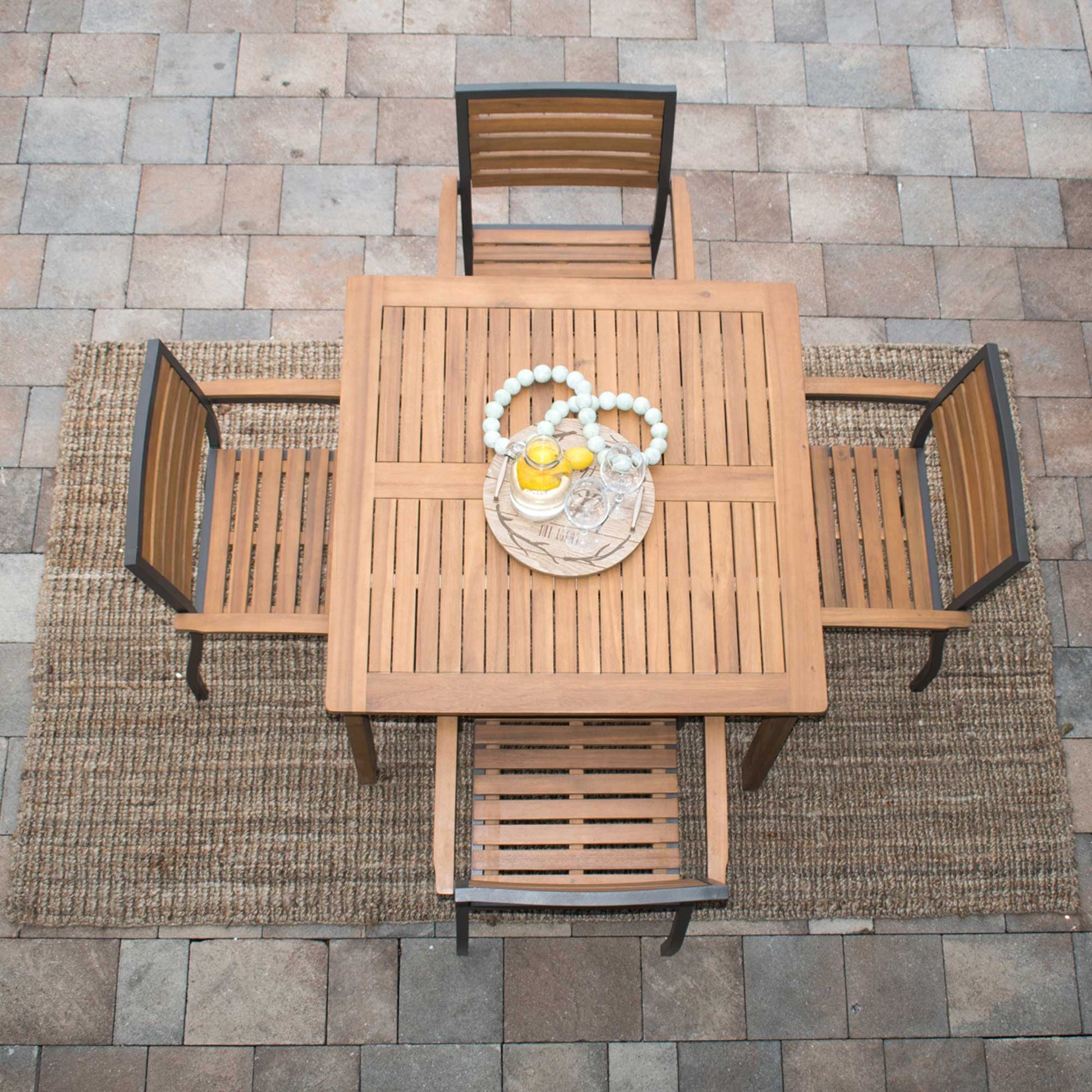 Transform your outdoor dining experience with the Boca Grande 5-Piece square dining set from Panama Jack. Constructed with durable and solid Acacia wood frames and extruded aluminum, this set includes a classic slatted tabletop that requires low-maintenance and provides a perfect gathering space for cherished memories with your loved ones. The stackable chairs offer slatted seat and backrest for unmatched comfort and easy storage, while the standard 100% off-white Polyester cushions ensure ultimate relaxation. For a more personalized touch, choose from our range of Sunbrella options. Restore the original golden teak color of the set with light sanding and teak oil application every few months. Enjoy your outdoor oasis with the Boca Grande dining set.