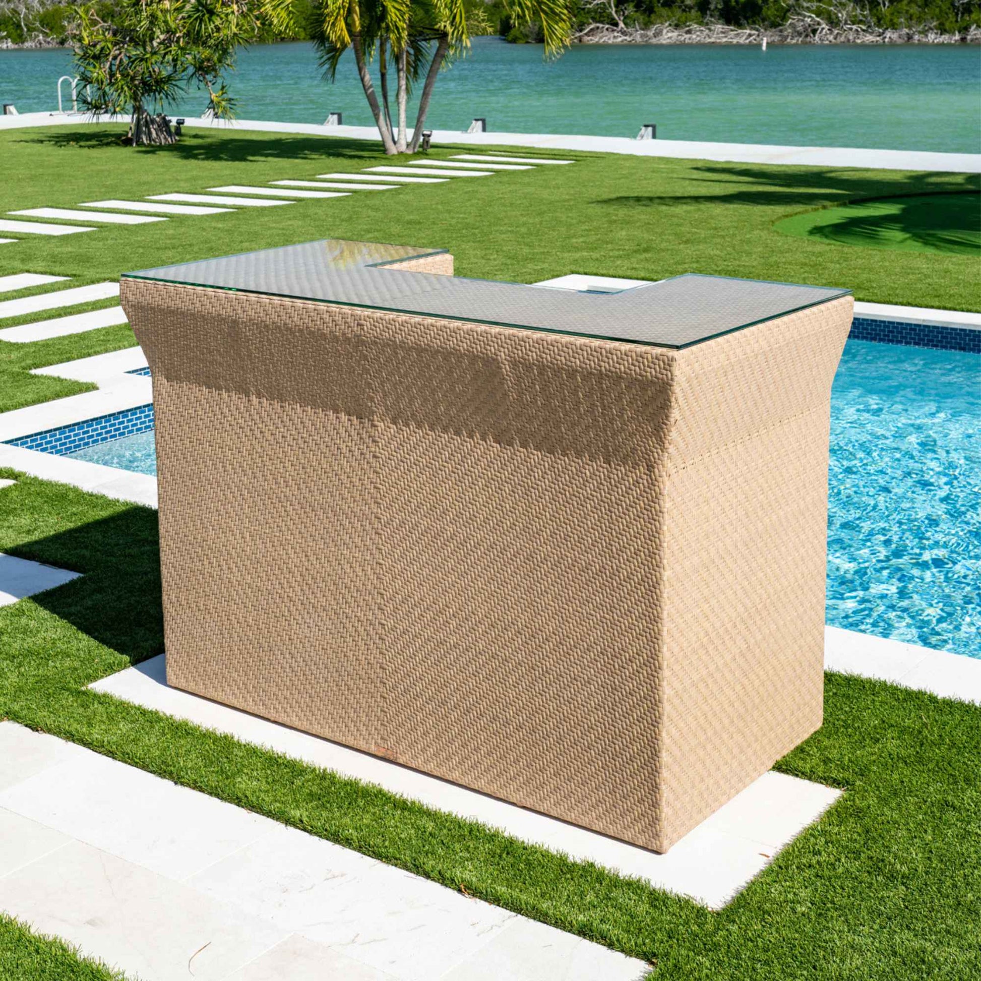 The Panama Jack Austin Bar with Glass blends tropical charm with commercial-grade durability, making it a stylish addition to any outdoor entertaining space. Crafted with a sturdy aluminum frame and handwoven synthetic fibers, this bar is designed for long-lasting use in all-weather conditions. The sleek tempered glass top provides a smooth, easy-to-clean surface, while built-in shelving offers convenient storage for drinks and essentials. Ideal for patios, poolside areas, or garden bars, this piece brings a resort-inspired feel to any setting.