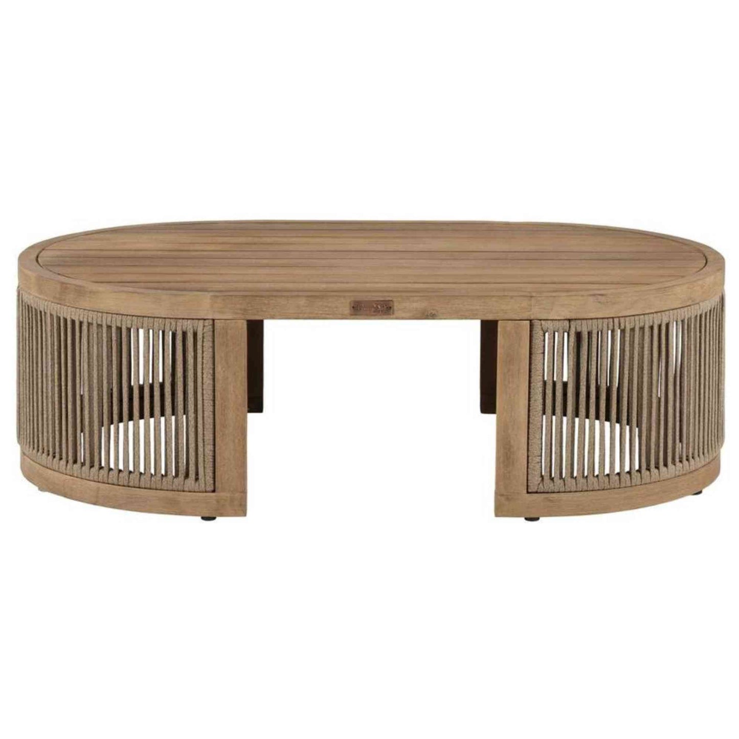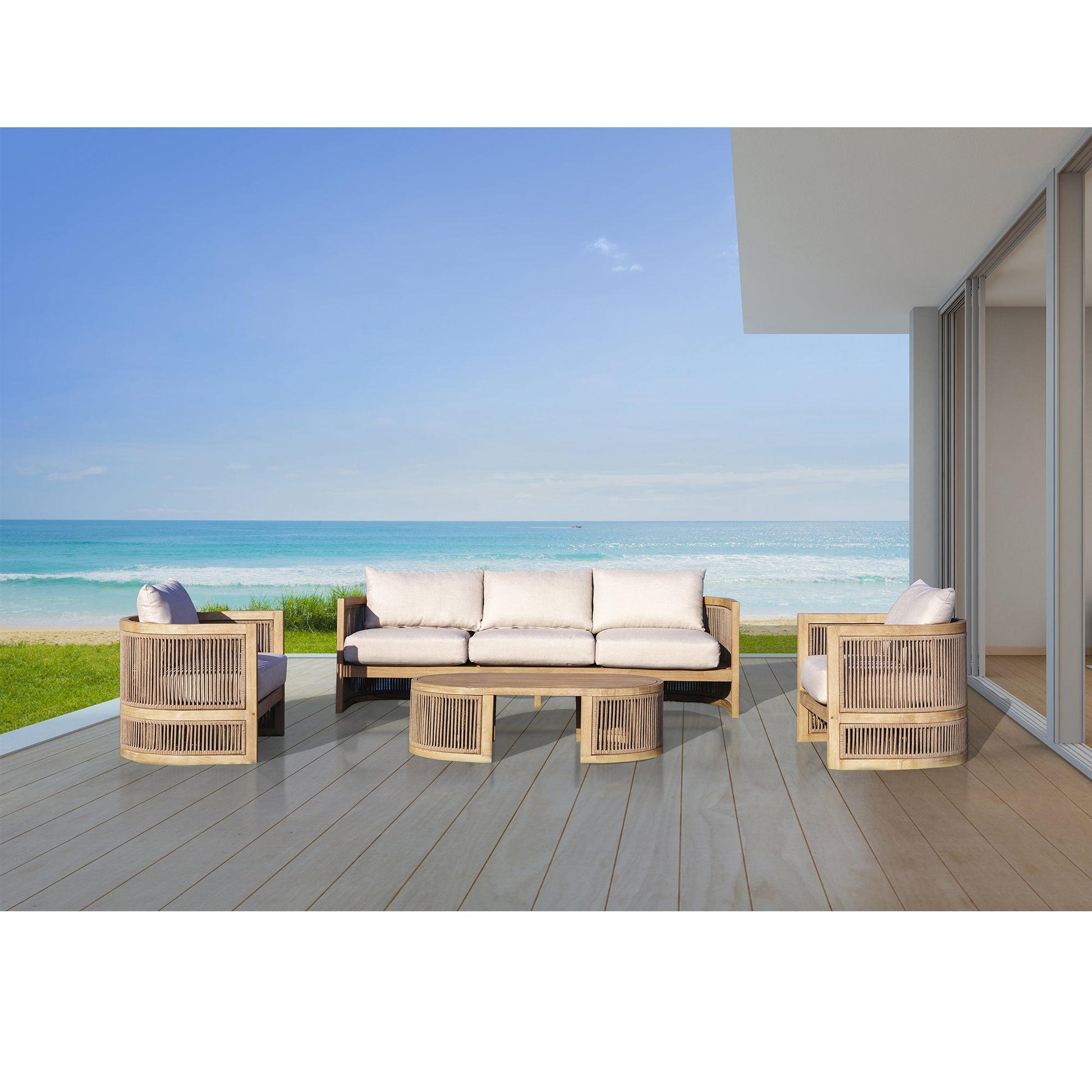 Revitalize your outdoor living area with the Panama Jack 4-Piece Cabo Seating Set. Constructed from solid Acacia wood, this ensemble showcases a honey-hued finish that's both elegant and durable. Included in this set is a sofa, two lounge chairs, and a coffee table, all designed with modern tan cording along their profiles. The cushions are adorned with a 100% polyester fabric that dries quickly, ensuring they're ready for any weather condition. For those looking to infuse their unique style, Sunbrella fabric options are available. To keep the Acacia wood's golden teak appearance, light sanding and teak oil application every few months are recommended. Embrace both sophistication and functionality with the exclusive Cabo collection.