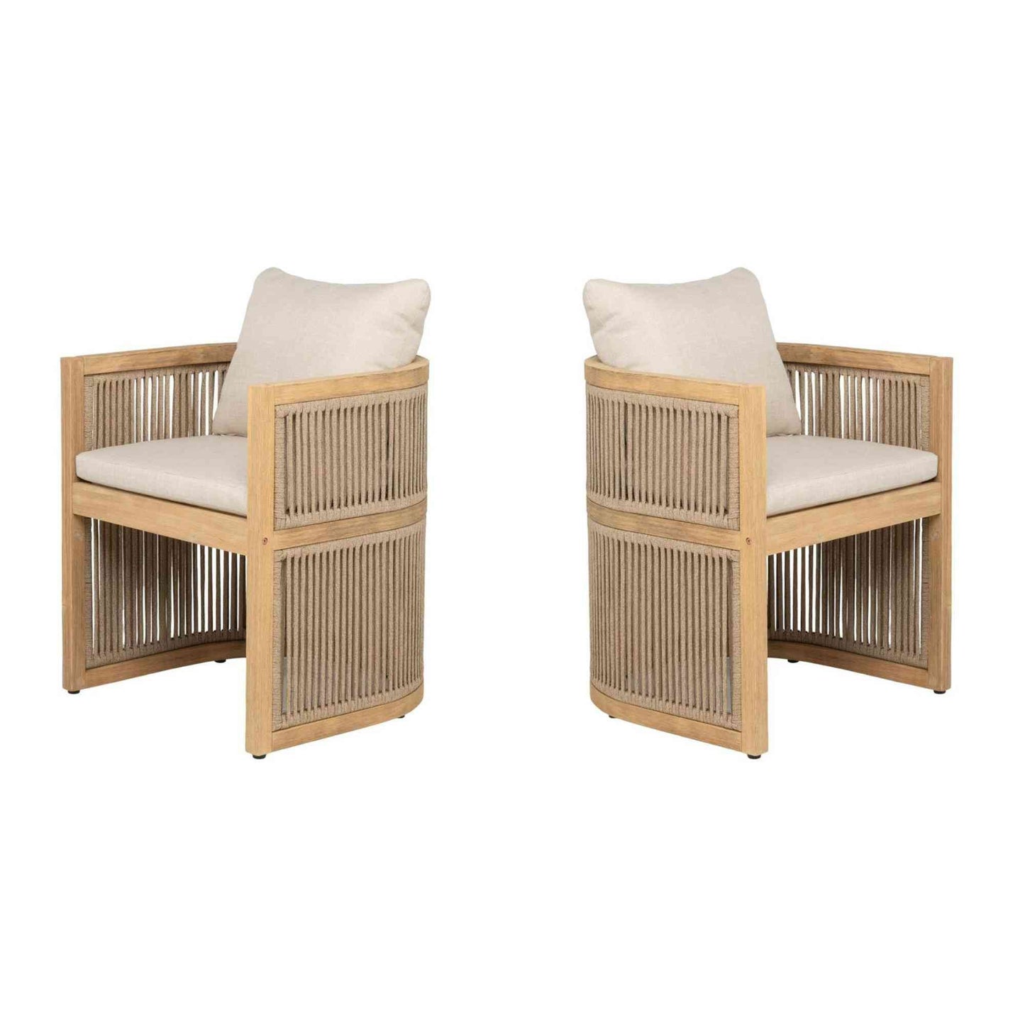 Dine in style with the Panama Jack Cabo 5-Piece Barrel Dining Set, perfect for enhancing any outdoor space. This set includes four barrel dining armchairs crafted with durable Acacia wood frames and accented with chic tan rope detailing for a modern, coastal look. Paired with a 48" round Acacia wood table, this set provides ample space for outdoor meals or casual gatherings. The plush cushions on the chairs ensure comfort, while the sturdy construction of both the chairs and table offers long-lasting durability. Ideal for patios, gardens, or poolside areas, the Cabo 5-Piece Dining Set brings both elegance and functionality to your outdoor entertaining space.
