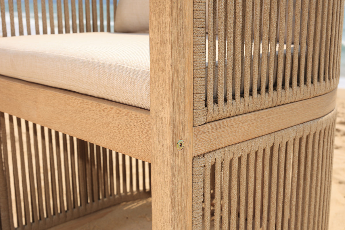 Elevate your outdoor dining experience with the Panama Jack Cabo Set of 2 Barrel Dining Armchairs. Crafted with a durable Acacia wood frame, these chairs feature an elegant barrel design accented with intricate tan rope detailing, offering both comfort and style. The plush cushions provide added relaxation, making these chairs perfect for alfresco dining or casual outdoor gatherings. Designed to complement the entire Cabo collection, these dining armchairs bring a natural, modern flair to your patio or garden. Whether for a casual meal or a special occasion, these chairs are a stylish addition to any outdoor dining area.