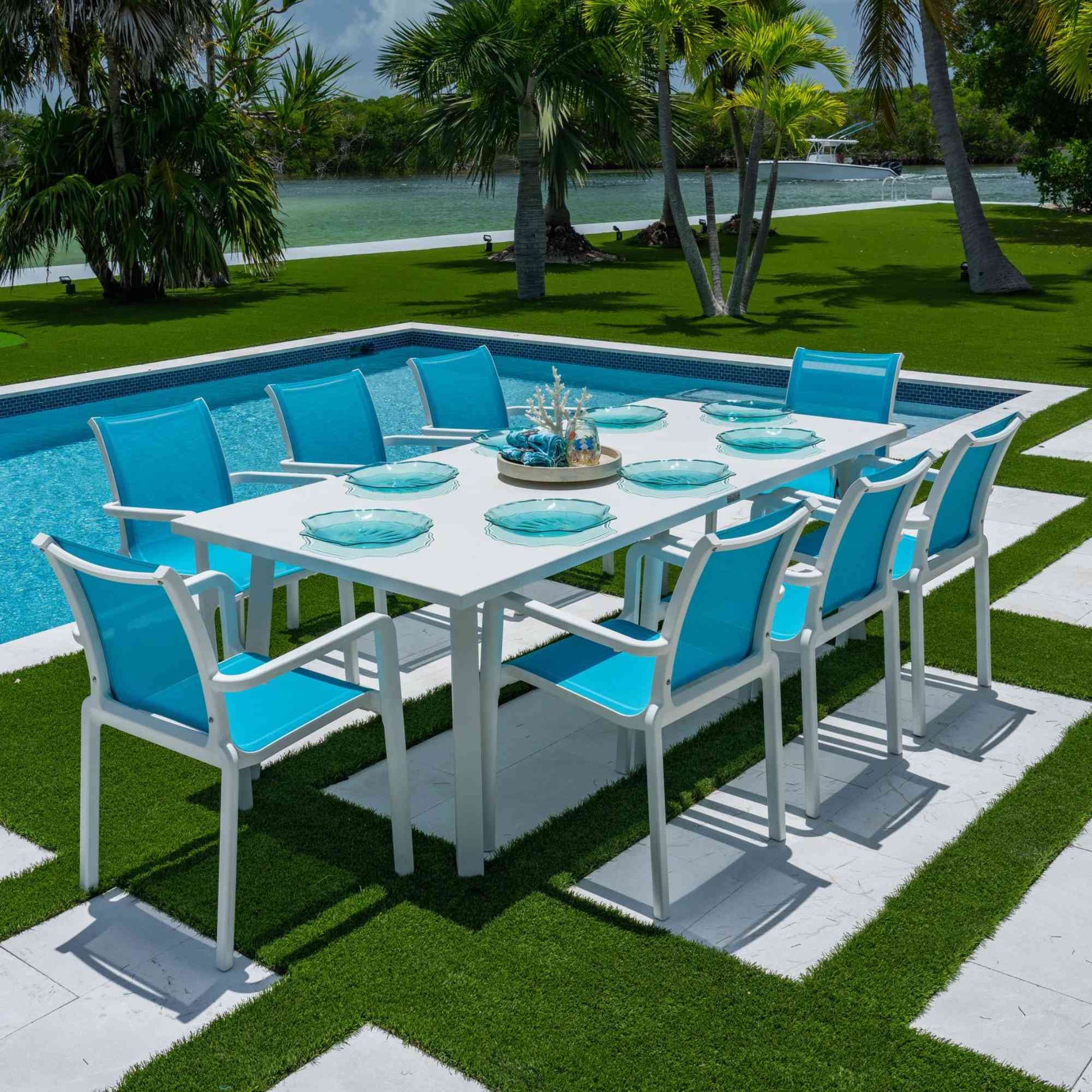 Transform your outdoor dining area with the Panama Jack Abaco 9-Piece Dining Set, perfect for hosting larger gatherings or family meals. This set features a spacious rectangular dining table with a sturdy tempered glass top and eight dining chairs, all crafted from weather-resistant polypropylene plastic. The chairs come with stylish and breathable teal sling seats, offering both comfort and a contemporary pop of color to your outdoor space. Whether for casual dining or entertaining guests, the Abaco 9-Piece Dining Set combines durability, modern design, and functionality, making it a perfect addition to any patio, garden, or poolside setup.
