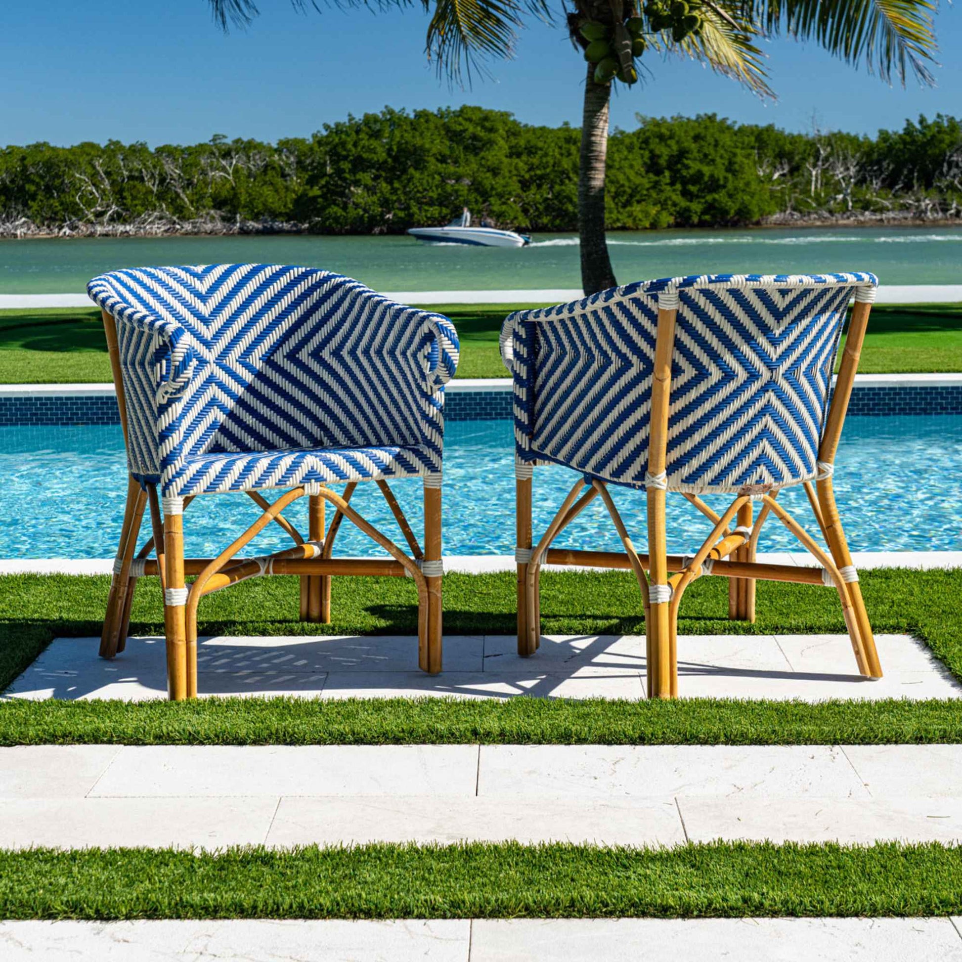 Bring a touch of coastal charm to your indoor or covered outdoor spaces with the Panama Jack Tia Bistro Armchairs. This set of two armchairs is crafted from natural rattan frames and a striking blue and white synthetic weave, creating a perfect blend of durability and style. With their lightweight yet sturdy construction, these chairs are easy to move and ideal for casual dining or lounging in any covered environment. Fully assembled for your convenience, these chairs exude timeless elegance while providing comfortable support for everyday use.
