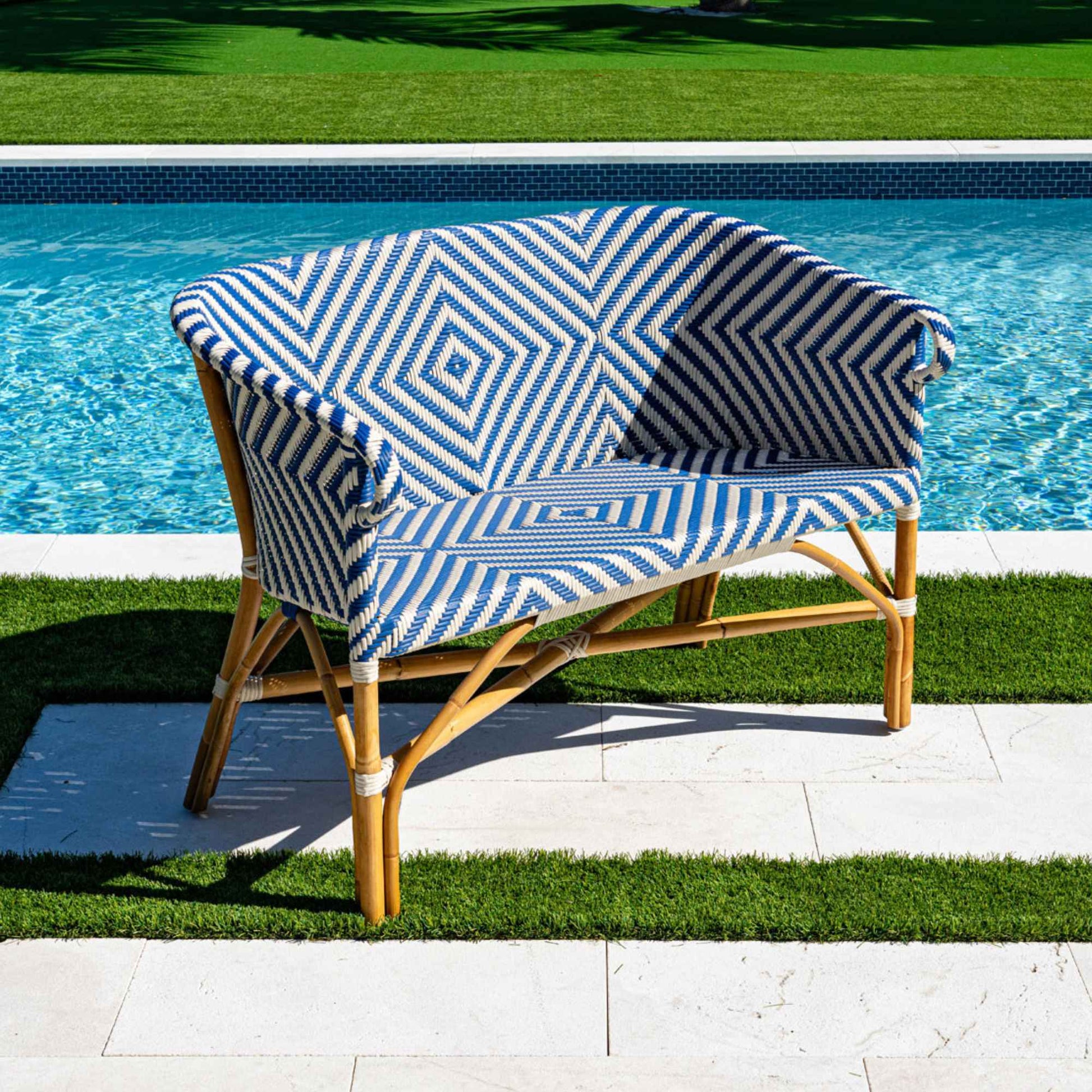 Elevate your indoor lounging experience with the Panama Jack Tia Bistro Loveseat, a captivating fusion of natural charm and artisanal craftsmanship. Featuring a striking blue-and-white synthetic weave expertly wrapped around a natural rattan frame, this loveseat is a statement of both comfort and style. Its cozy, curved design offers ample seating, perfect for intimate gatherings or quiet relaxation. Lightweight yet sturdy, this loveseat is ideal for covered patios or indoor spaces, ensuring a versatile addition to your home.