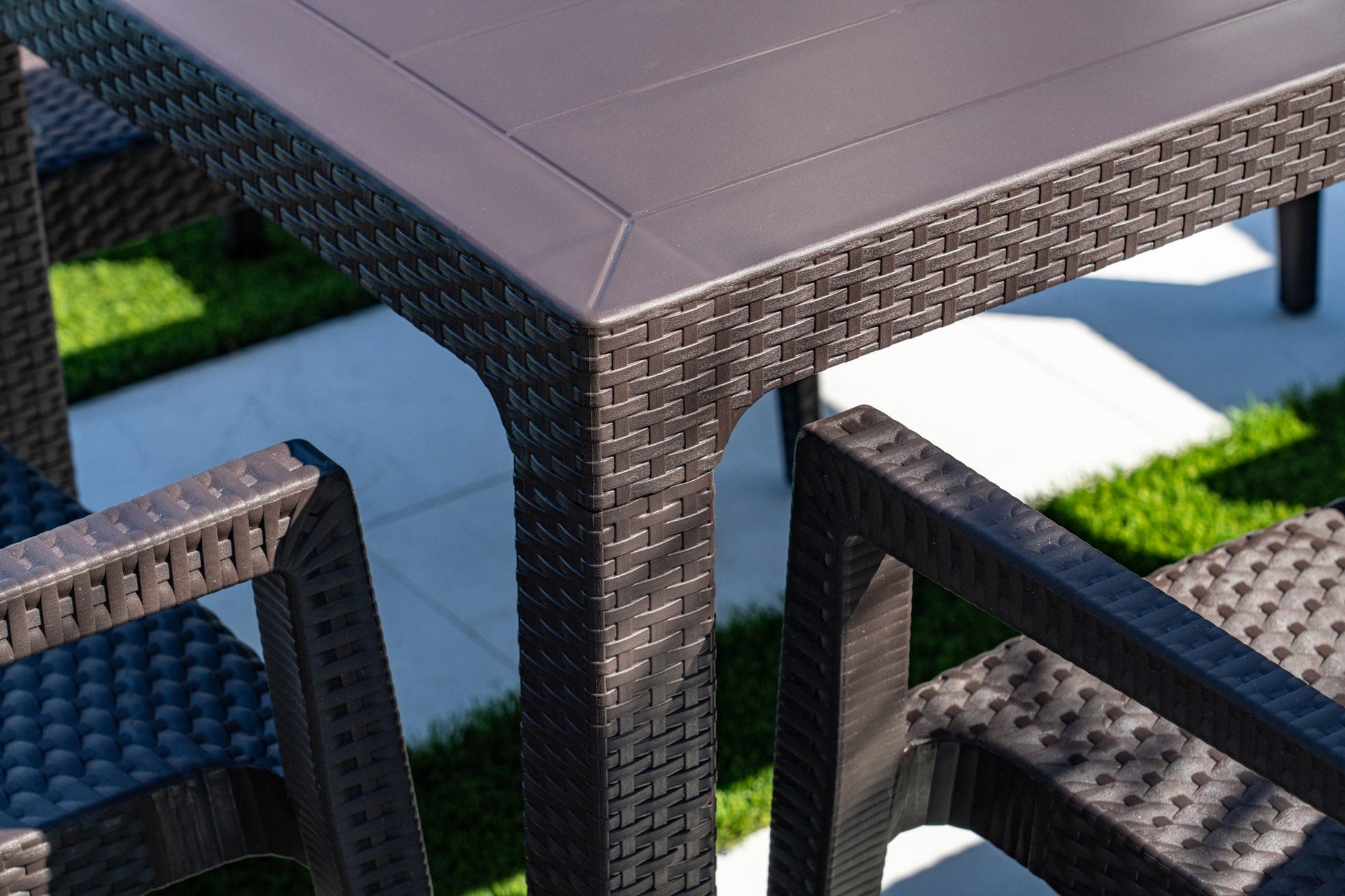 Elevate your outdoor dining experience with the Montana dining series. This 5-piece set includes 4 stackable chairs made of UV-resistant resin reinforced with glass fiber for durability. The modern look of the flat wicker is easy to clean, and the chairs are produced with gas-assisted injection technology for added strength. The square table is made of UV-resistant resin and features an easy snap-on self-assembly system, with galvanized tubes on the sides for improved stability. The resin structure of both the chairs and table will never rust or decay, making this set perfect for both commercial and residential use.